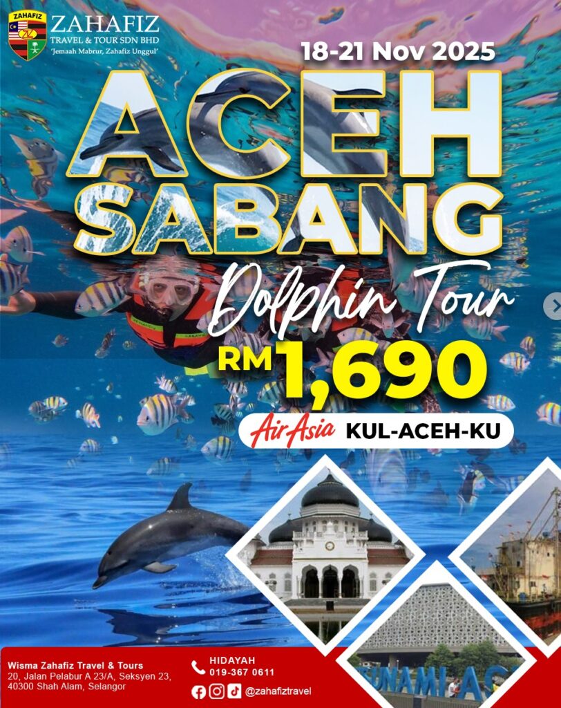 Tempah promosi trip istimewa 2025 ke Aceh Sabang (Dolphin Tour) hanya bersama Zahafiz Travel. Atau hubungi terus pegawai jualan kami dengan menekan butang Whatsapp yang disediakan di bawah.